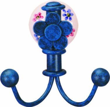 Patere design. Composite support forgees design fleur PH222. Patere design couleur terminee a oxyde bleu. Enjoliveur en ceramique decoree.