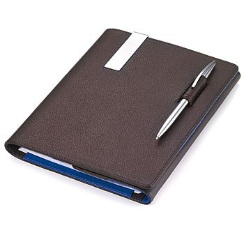 Porte-documents incl. un cahier à spirales DIN A5, PU/cuir, avec clip en métal pour reçus (chrome brillant) et 8 compartiments pour cartes de visite, incl. stylo à bille "SLIM", marron/bleu